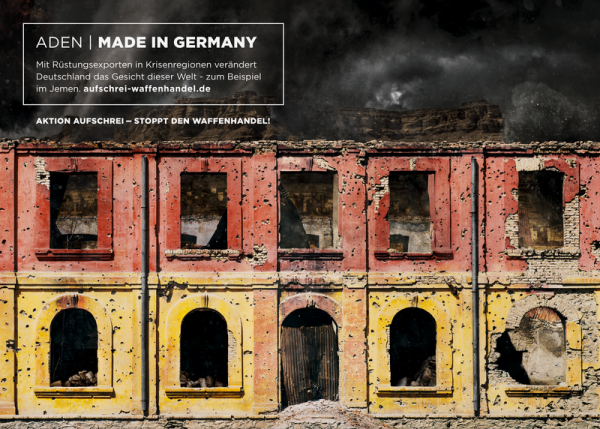 Almanya’da savaş karşıtı ve barış yanlısı organizasyonlar “Haykırma eylemi-Silah ticaretini durdur” adıyla bir kampanya başlattılar. Kampanya çerçevesinde Alman silah şirketlerinin Türk devleti ve Suudi Arabistan ile sürdürdüğü işbirliğine dikkat çekmek amacıyla Efrîn’deki işgal ile Yemen’in Aden ve Saada kentlerinde yaşanan savaşı anlatan afişler hazırlandı.