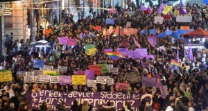 İstanbul: 25 Kasım Platformu’nun çağrısıyla yüzlerce kadın Taksim’de bir araya gelerek „Erkek devlet şiddetine karşı direniyoruz, yaşam hakkımızı savunuyoruz“ dedi. Taksim Tünel’den, Galatasaray Lisesi Önüne yürüyen kadınlar, “Susmuyoruz, korkmuyoruz, itaat etmiyoruz”, “Erkek vuruyor devlet koruyor”, “Nusaybin’de işgalci Özgecan’ın katili”, ” Kürdistan’da direnen kadınlara bin selam”, “Tecavüzcü bizden koksun”, “Özsavunma haktır”, ” Öldüren sevgi istemiyoruz” sloganları yanı sıra “Bedenimiz devletin savaş alanı değildir” yazan, erkek-devlet şiddeti, ...