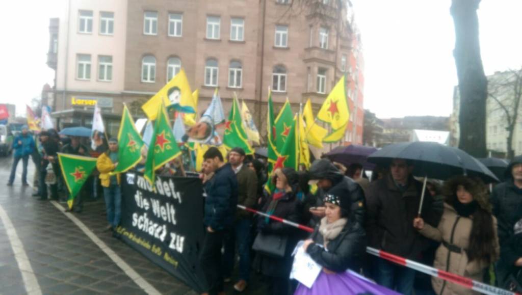 NÜRNBERG- Bugün saat 15.00 civarında yoğun yağmura rağmen 200 kadar insan,Cizre`de Türk devletinin vahşi katliamını kınamak ve protesto etmek için Nürnberg Türk Konsolosluğu karşısında toplandı. NAV DEM, ATİK, AGİF, Partizan, AABF, DiDF gibi kurumların destek verdiği Miting`de yapılan türkçe, almanca ve kürtçe konuşmalarda Kürt ulusunun haklı direnişinin kanla ve zorla bastırılamayacağı ve direnenlerin kazanacağı söylendi.