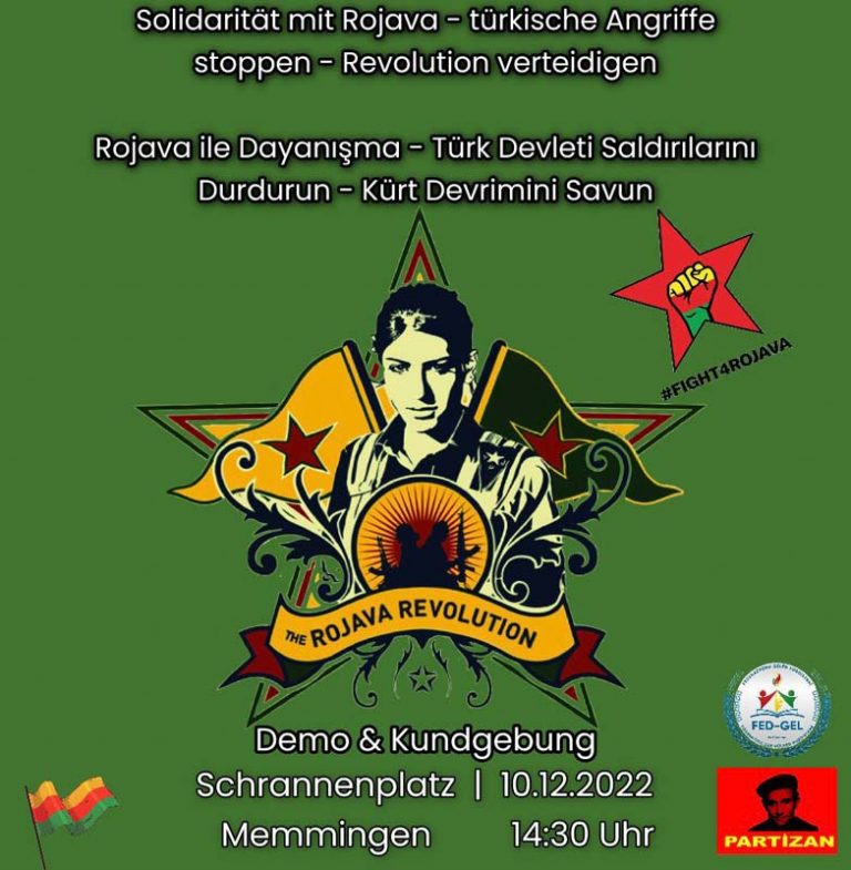 HABER MERKEZİ|06.12.2022| Bu Cumartesi, 10 Aralık’ta Memmingen’de “Rojava ile Dayanışma – Türk Devletinin Saldırılarını Durdurun – Kürt Devrimini Savun!” mottosuyla miting ve yürüyüş gerçekleştirilecek. Yoğun katılımın beklendiği miting Schrannenplatz’da saat 14.30’da başlayacak. Eyleme FED-GEL ve PARTİZAN tarafından da çağrı yapıldı. Eyleme İçinde Alman antifaşistler de çağrıda bulundu. Geçtiğimiz günlerde de şehir merkezinde işgalci saldırıların protesto edildiği miting düzenlenmişti.