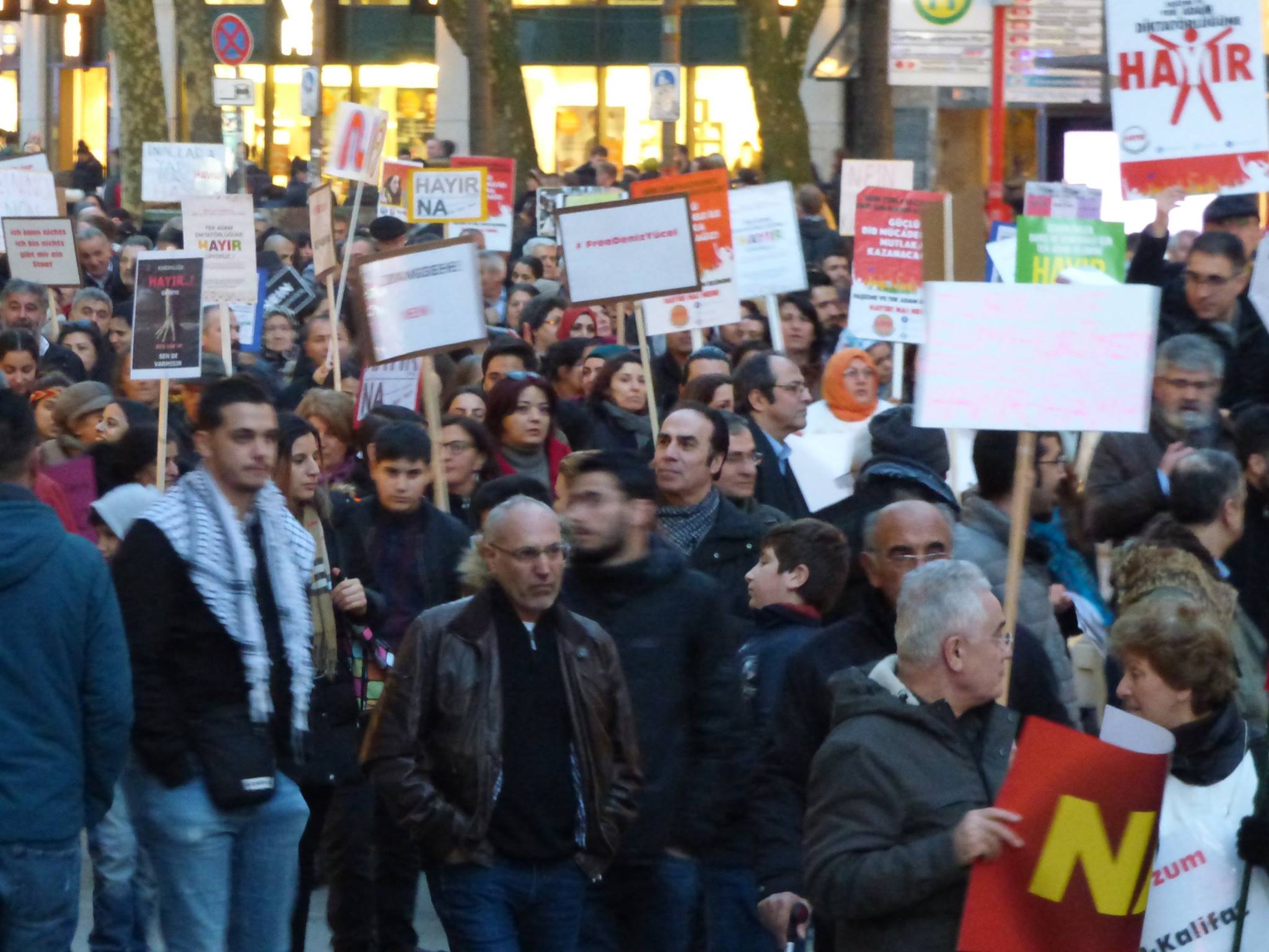 11.03.17 Cumartesi günü referandum kapsamında Hamburg’ta Hayır diyen kurumların organize ettiği merkezi oluşan Hayır platformunun da içerisinde yer aldığı bir yürüyüş gerçekleştirildi. Kitlesel katılımlı gerçekleşen yürüyüşte bayraksız , dövizlerle katılım sağlandı.Yapılan konuşmalarla Türkiye ve T.Kürdistan’ındaki durum kamuoyuna anlatılarak mevcut süreçte Hayır’ın çeşitli nedenleride kamuoyuna açıklandı.Merkez tren garı (Hauptbahnhof)’ta yapılan konuşmalarla saat 17’de başlayan yürüyüş Hamburg Belediye Sarayı (Rathaus)’a kadar sloganlarla coşkulu bir biçimde sürdü.Çeşitli demokratik kurumların yanı sıra Özgür gelecek okurları ve Atif taraftarlarının da katıldığı yürüyüşe Ö.G yazı işleri müdürü gazeteci Aslı Ceren Aslan ve Atik ,Yeni Kadın üyesi Dr.Banu Büyükavcı’nın dövizleri ile Tek Adam diktatörlüğüne HAYIR yazan Almanca dövizler taşındı.