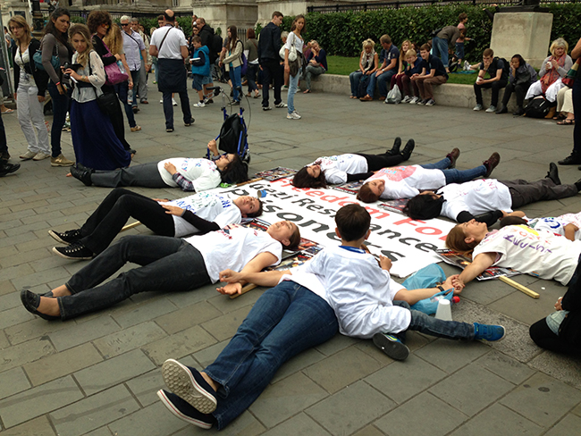 LONDRA |17-08-2013| Londra Gezi dayanışma çadırı kadın komisyonu gezi tutsaklarının sesi olmak ve Rojavada ki katliamları duyurmak için Trafalgar meydanında 17 Ağustos cumartesi günü bir eylem gerçekleştirdi. Beyaz tişörtler üzerine (AB-ABD-Türkiye finanse ediyor, El-Nusra katlediyor!, Politik Tutsaklara Özgürlük!, Rojava’daki Katliama Son!,Gezi Tutsakları Serbest Bırakılsın!, Mısır’ da Faşist Saldıralar Son!, Diren Rojava Londra Seninle!) yazdıkları sloganları ile yerde yatarak bir daire oluşturan kadınlar sık sık attıkları sloganlarla da kitlenin yoğun ilgisini topladı. Bir saat suren eylem boyunca yoğun bir şekilde meydan da bulunan kalabalık kitleye, kadınları bugün alanlara döken nedenleri, direnişlerini ve taleplerini dillendirdiği bildiriler dağıtıldı. Daha sonra cumartesi anneleriyle dayanışma eylemi ile devam ettirilerek, alkış ve sloganlarla bitirildi…