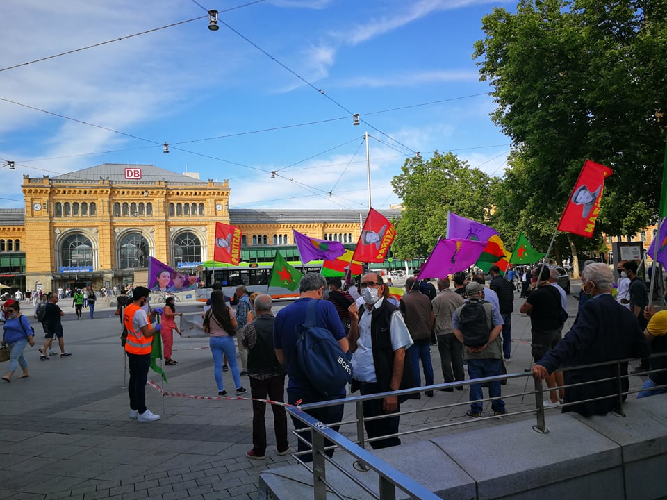 HANNOVER |24.06.2020|Hannover’de, faşist Türk devletinin saldırısı sonucu, Kobanê’de yaşamını yitiren üç kadın için miting düzenledi. Faşist AKP – MHP bloğunun Kürt halkına yönelik imha ve inkar politikalarının ürünü olan „sınır ötesi operasyon“ sonucu katledilen kadınları anmak ve TC’nin faşist yüzünü kamuoyuna teşir etmek için 24 Haziran çarsamba günü Hannover tren garı önünde miting gerçekleştirildi. Miting’de, faşist Türk devletin katliamcı politikalarının, Kürt halkı başta olmak üzere bölgede yaşayan tüm halklara karşı olduğunu, ne olursa olsun kazananın direnen halklar olacağı vurgulandı. Fed-Dem ‚in düzenlediği mitinge Partizan ve ATİF Hannover’de destek verdi. Eylem sloganlar ile son buldu.