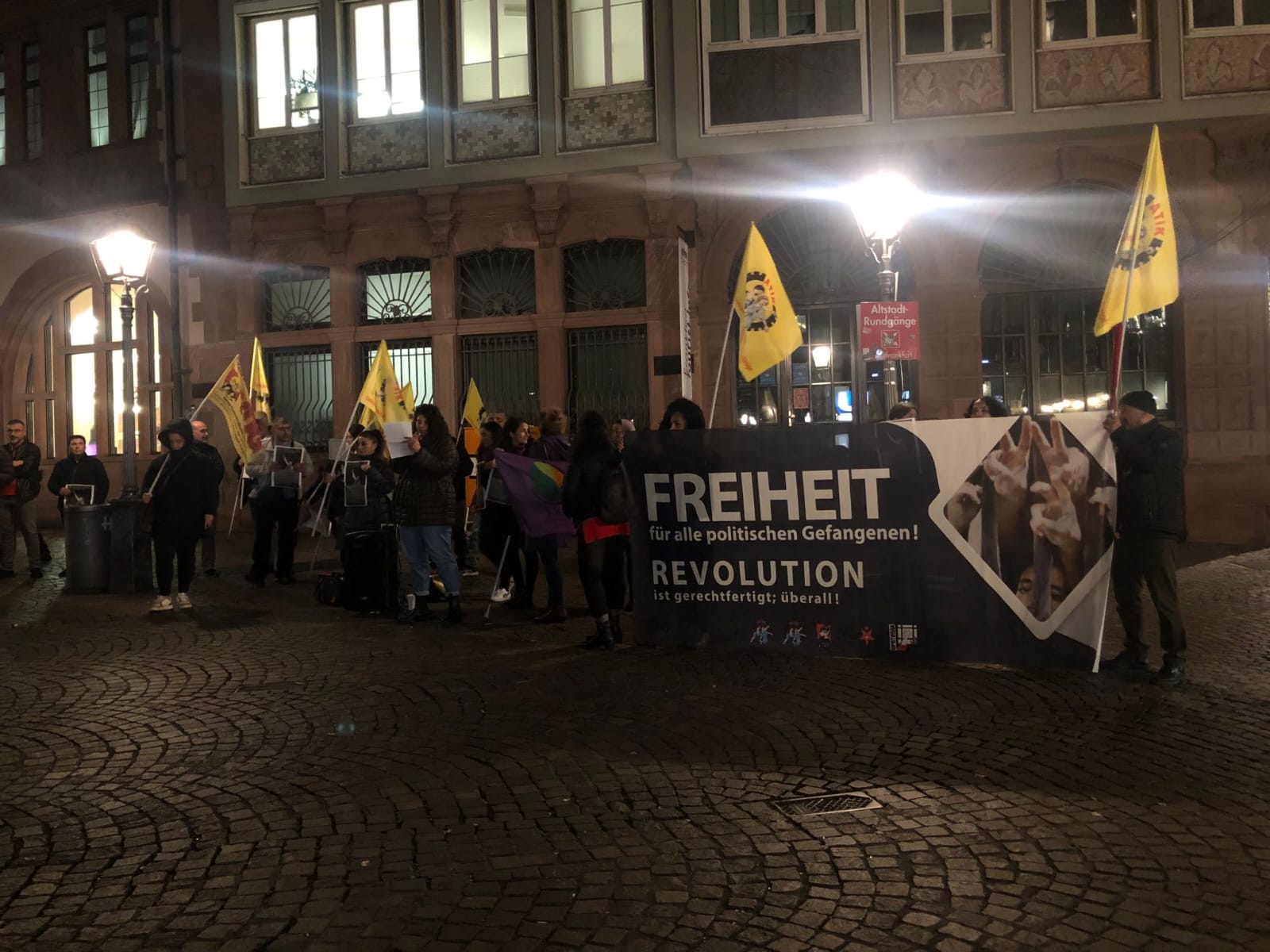 Saat 19’da Mannheim ana garının önünde toplanan kitle, almanca, türkçe ve kürtçe sloganlar atarak saldırılara duyduğu tepkisini gösterdi. Almanca ve kürtçe yapılan konuşmalarla faşist Türk Devletinin saldırılarının özellikle Erdoğan’ın Merkel, Macron ve Putin ile bir araya gelmesinden sonra başlatıldığına dikkat çekti. Emperyalist güçlerin kendi çıkarları doğrultusunda insan yaşamını hiçe saydığı saldırılarda yine onlarca sivil yaralanmış, Çarşamba günki çatışmalarda da dört YPG gerillası şehit düşmüş, altısı da yaralanmıştı. SDK; yaptığı bir açıklamasında Rojava’ya ilişkin Türk Ordusunun bütün saldırılarına karşılık vereceğini de belirtti.