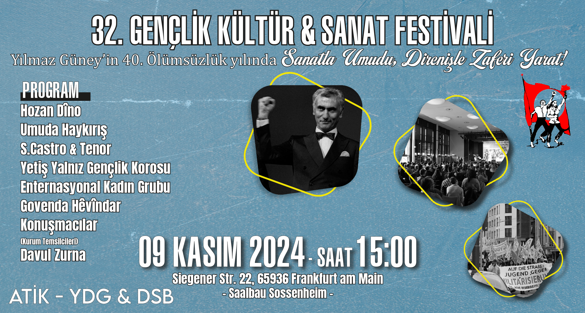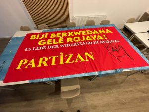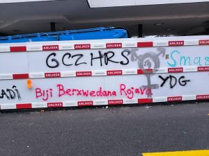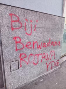 YDG’liler “Revolution in Rojava Verteidigen – Biji Berxwedana Rojava” pankartı taşıdı.