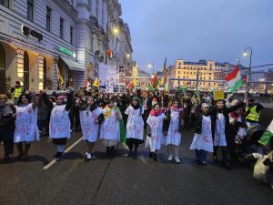 Yeni Kadın, Almanca “Der Widerstand der Frauen wird die Barbarei besiegen – Jin Jiyan Azadi” yazılı pankartla yürüyüşe katılırken,