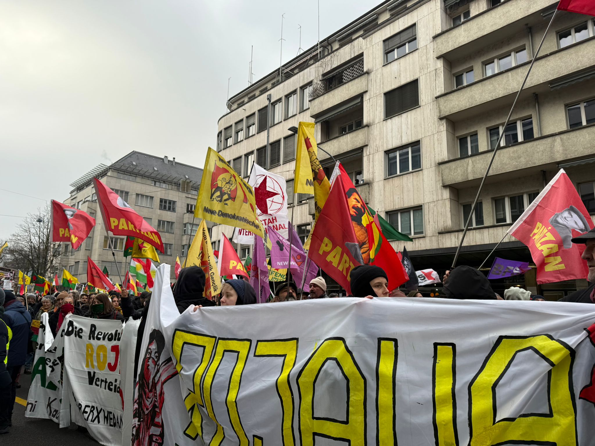 Zürih sokaklarında büyük bir coşkuyla ilerleyen yürüyüş sırasında havai fişekler atıldı, çeşitli noktalara yazılamalar yapıldı. Eylem, saat 18.00’de Helvetiaplatz’da yapılan konuşmalarla sona erdi.