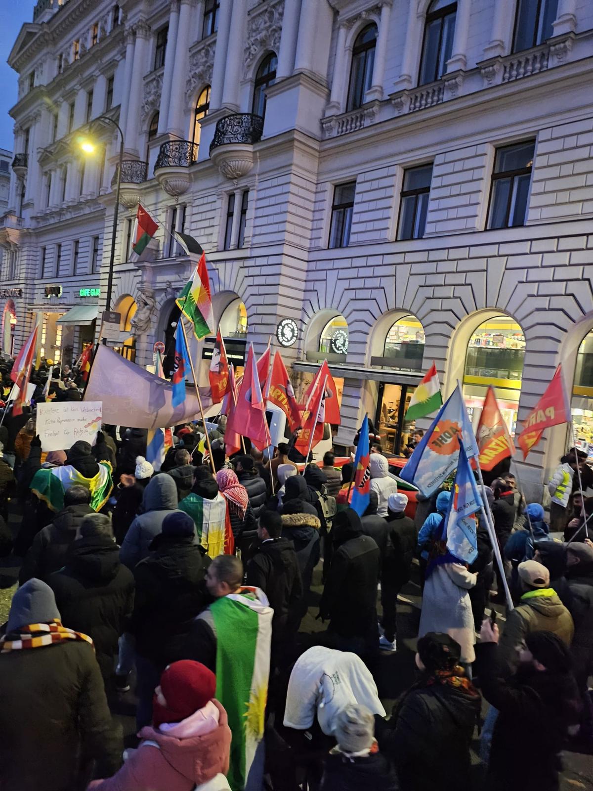 24 Ocak saat 16.00’da Viyana’da binlerce kişi Votivpark’ta bir araya gelerek ABD Konsolosluğu’na yürüdü. Rojava’ya yönelik saldırılara, emperyalist savaş politikalarına ve faşist işgal girişimlerine karşı öfke sokaklara taştı.