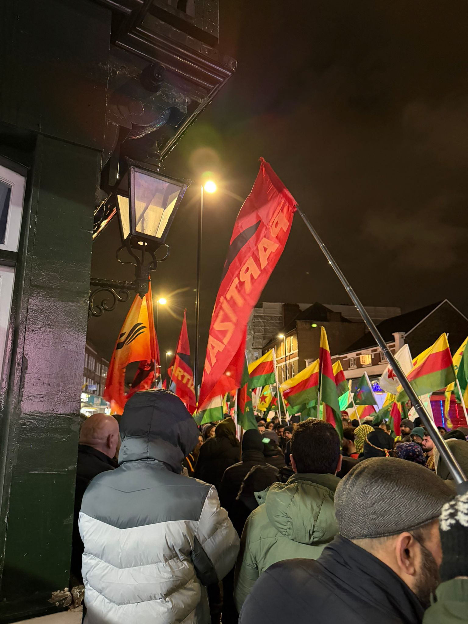 Ardından yapılan mitingde konuşmalar gerçekleştirildi; Rojava’daki direniş selamlandı ve dayanışma mesajları verildi. Alan “Biji Berxwedana Rojava” ve “Kobane” sloganlarıyla yankılandı.