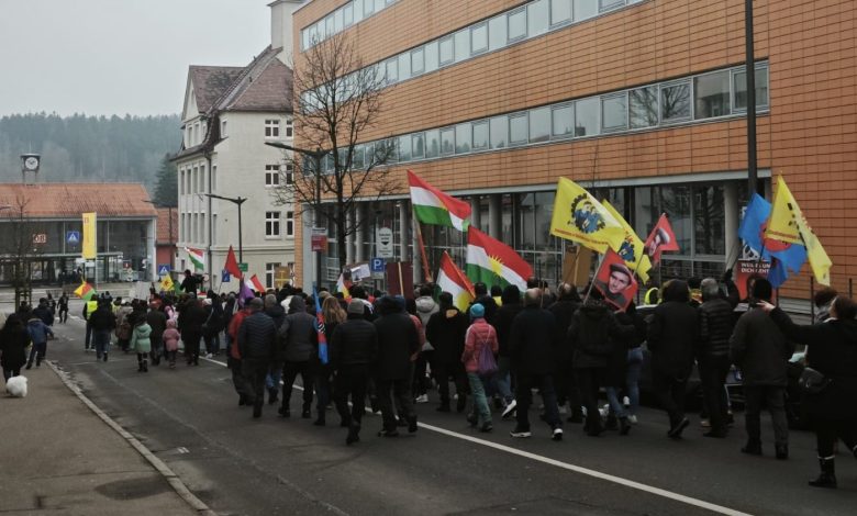 Konuşmaların ardından şehir merkezine doğru yürüyüşe geçen kitle; “Jin, Jiyan, Azadî”, “Kîne em? Kurd in em”, “Terörist Colani, terörist Erdoğan”, “Hoch die internationale Solidarität”, “Bijî berxwedana Rojava” ve “Bijî berxwedana YPG-YPJ” sloganlarını attı.