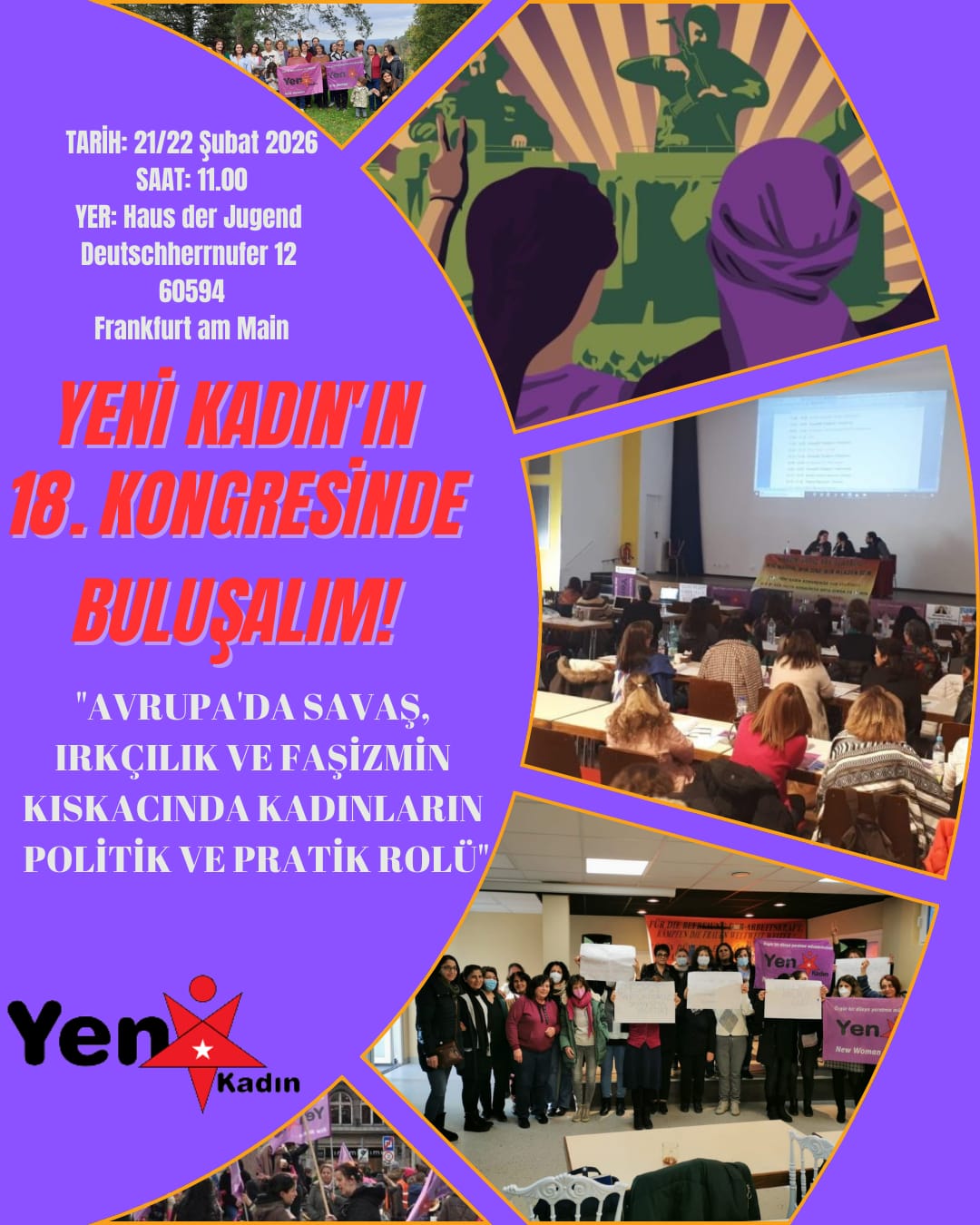 HABER MERKEZİ|14.02.2026| Yeni Kadın, 18. Merkezi Kongresi’ni 21–22 Şubat 2026 tarihlerinde gerçekleştireceğini duyurdu. Kongrede, Avrupa’da derinleşen savaş politikaları, ırkçılık ve faşizmin kadınlar üzerindeki etkileri ile kadınların politik ve pratik rolü ele alınacak.